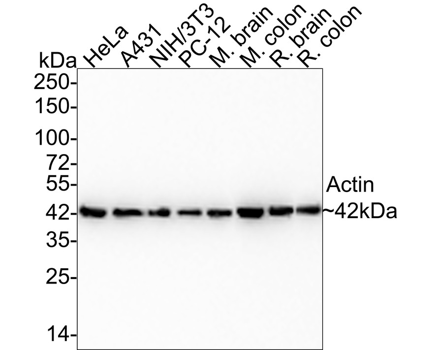 HeLa cell lysate, A431 cell lysate, NIH/3T3 cell lysate, PC-12 cell lysate, mouse brain tissue lysate, mouse colon tissue lysate, rat brain tissue lysate, rat colon tissue lysate, human colon carcinoma tissue, hybrid fish (crucian-carp) brain tissue lysate, hybrid fish (crucian-carp) kidney tissue lysate, NIH/3T3, mouse cardiac muscle tissue, mouse smooth muscle tissue.