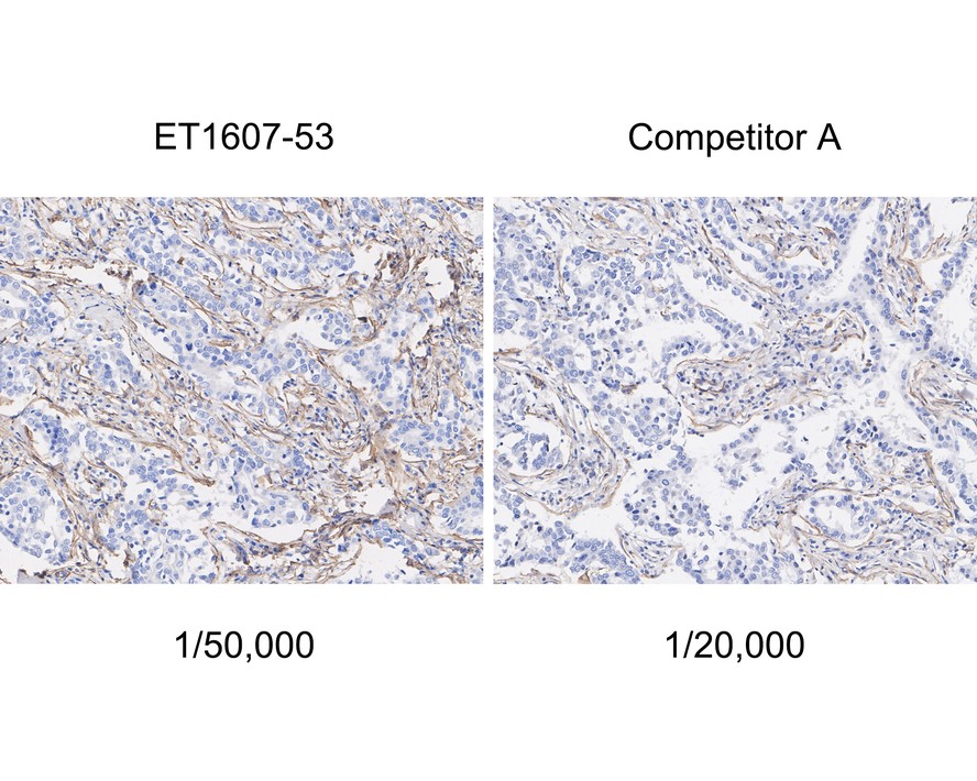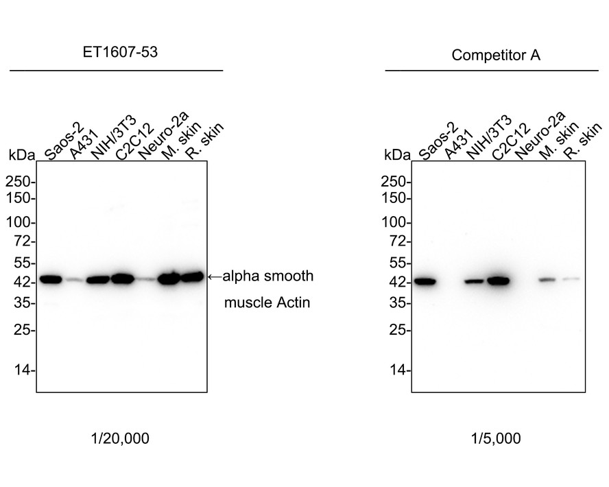 Proteins were transferred to a PVDF membrane and blocked with 5% NFDM/TBST for 1 hour at room temperature. The primary antibody (ET1607-53) at 1/20,000 dilution and competitor's antibody at 1/5,000 dilution were used in 5% NFDM/TBST at 4℃ overnight. Goat Anti-Rabbit IgG - HRP Secondary Antibody (HA1001) at 1/50,000 dilution was used for 1 hour at room temperature.