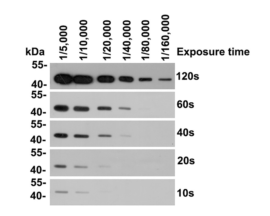 Proteins were transferred to a PVDF membrane and blocked with 5% NFDM/TBST for 1 hour at room temperature. The primary antibody (EM21002) at serial dilution was used in 5% NFDM/TBST at room temperature for 2 hours. Goat Anti-Mouse IgG - HRP Secondary Antibody (HA1006) at 1:100,000 dilution was used for 1 hour at room temperature.