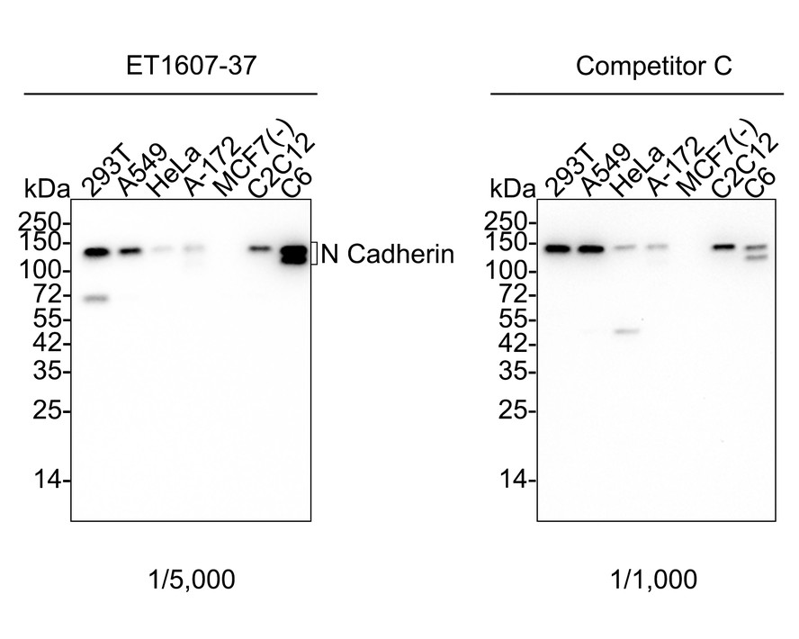 Western blot analysis of N Cadherin on different lysates with Rabbit anti-N Cadherin antibody (ET1607-37) at 1/5,000 dilution and competitor's antibody at 1/1,000 dilution.